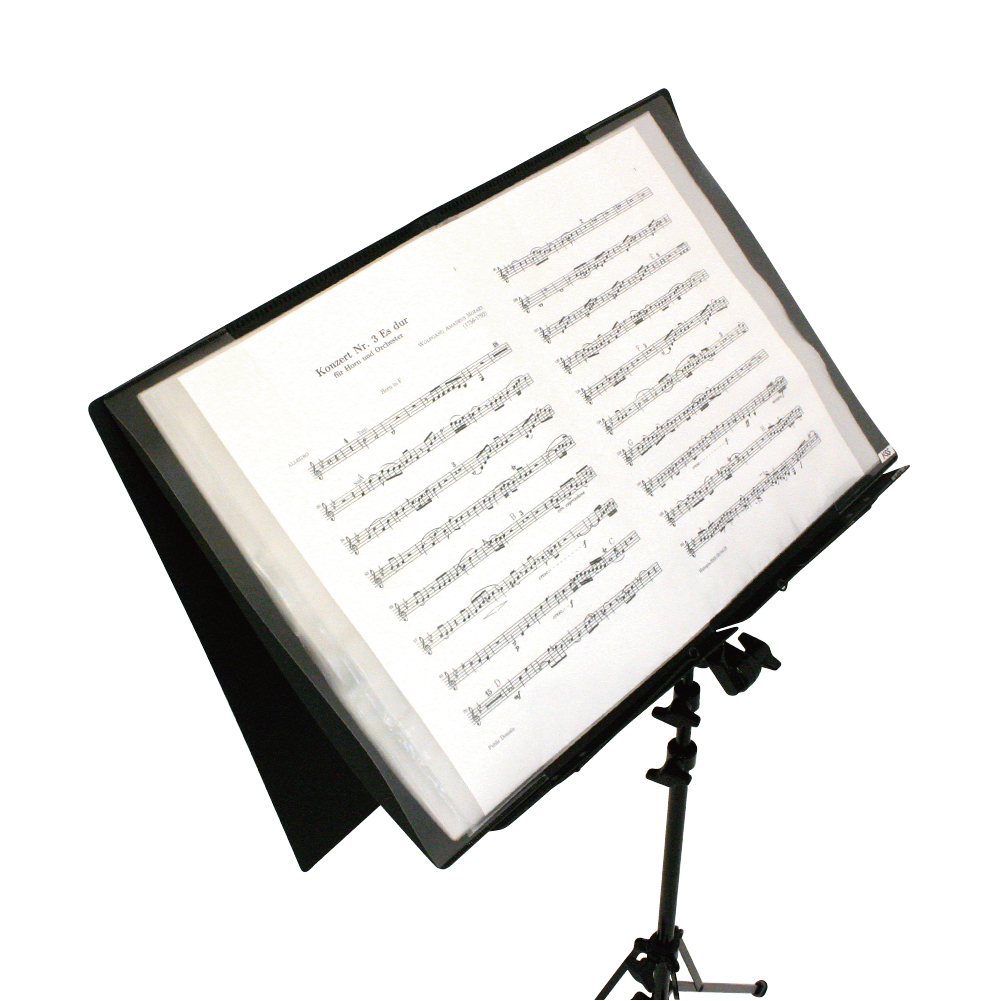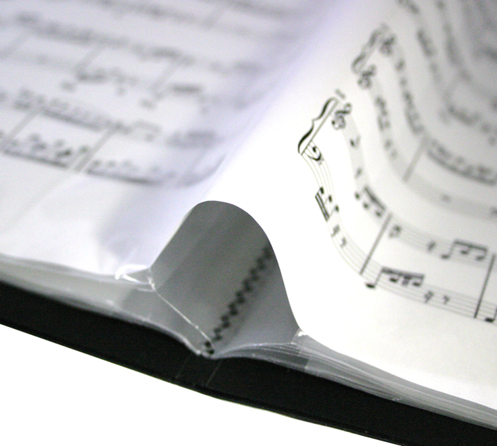 ポケットは中心と上部が開いているので差替えがスムーズにでき、ファイル自体はフラットに開くので楽譜が見やすくなります。